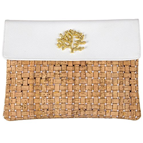 Basket weave cork clutch features shiny gold sea life icon, pebbled faux leather flap accent and magnetic snap closure.Feature