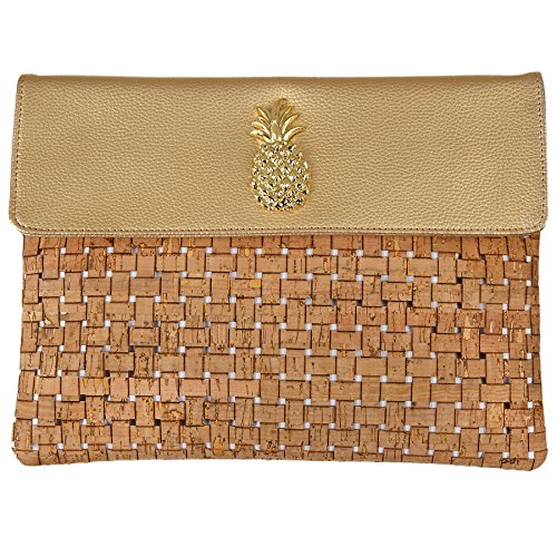 Basket weave cork clutch features shiny gold sea life icon, pebbled faux leather flap accent and magnetic snap closure.