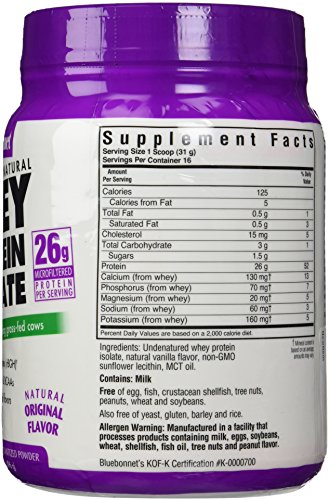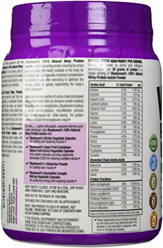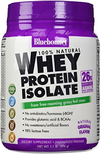 ReleaseDate : 2015-11-16 Studio : BlueBonnet Publisher : BlueBonnet Binding : Health and Beauty Product Description Bluebonnet's 100% Natural Whey Protein Isolate is sourced from grass-fed cows that are not treated with antibiotics or recombinant bovine growth hormone (right), also known as bovine somatotropin (BST). Additionally, whey protein has the highest biological value (BV) of any protein on the market, which refers to a protein that has all of the essential amino acids in adequate quantities to sustain growth and development. Whey is also a rich and natural source of branched chain amino acids (BCAAs) and glutamic acid. 0