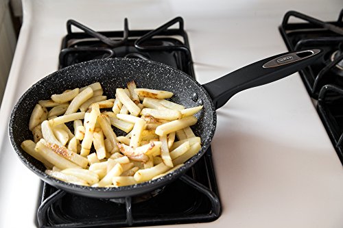 The Zyliss 8 and 11 inch frying pan set brings a modern approach to the kitchen with its implementation of Swiss coating technology. The 3-layer non-stick pan is reinforced with the ultimate ceramic coatings makes this a guaranteed nonstick pan. The small grooves in the surface of the pan collect oils and fats reducing the need to constantly lubricate surface. This multi-purpose pan can withstand temperatures up to 356 DegreeF, making it usable on both stove tops and ovens.Feature