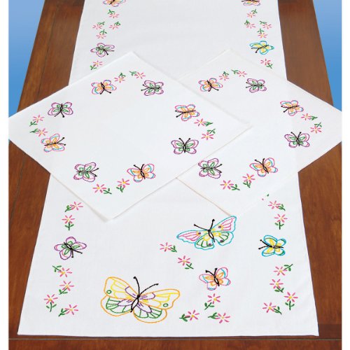 Jack Dempsey Stamped Dresser Scarf and Doilies Perle Edge, Fluttering Butterflies