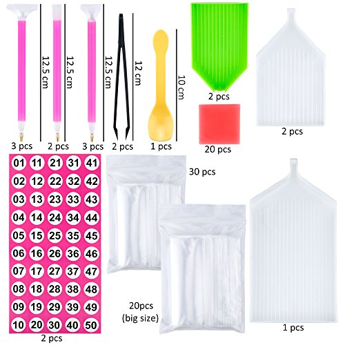 - PACKAGE INCLUDED - 30pcs small bags,20pcs large bags,8pcs different designs of sticky pen,5pcs plastic trays,2pcs lable stickers,2pcs plastic tweezer,20pcs glue,1pcs spoon and 21 slots embroidery box...lots of accessories match your needs.