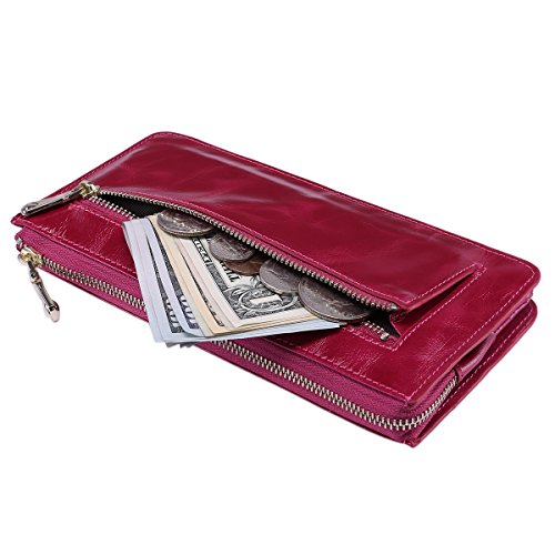 -. Feature : GENUINE LEATHER- The clutch size purse made from Advanced Grained leather with wax finish, feels luxury and comfortable,shiny golden-tone hardware and zippers. / LARGE CAPACITY-Contains 3 generous full-length pockets, 14 card slots (including 1 id window), one interior zippered pocket and one zipper coin pocket outside. It can hold a passport,iphone 6/7 plus, cards and cash.The leather wrist strap makes the clutch wallet easy to carry. / GREAT ORGANIZATION: multifunctional but thin design, the clutch can keeps your credit cards, cash, coins, check book and your cell phone separated and secure, but just in one hand, compact to fit for the tote, handbag when travelling. / DIMENSIONS: 7.48 L x 3.94 W x 0.59 H inch, comes in a gift box and it is already ready to be a great gift for your family and friends.Perfect for a night out /travel/dating. / 1 - YEAR MONEY-BACK GUARANTEE ensures your satisfaction. If you are not delighted by our wallet return it within 12 months for a full refund of your purchase price.