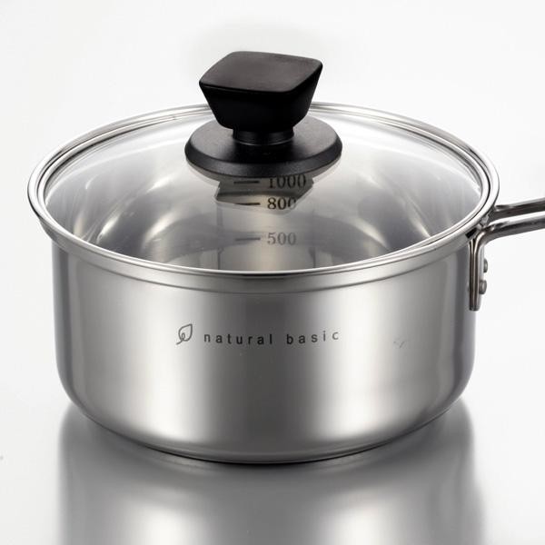 | 素材・材質 | 本体/18-8ステンレス(底厚0.5mm) 底部(底厚合計3.0mm)/アルミニウム(板厚2.0mm)、18-0ステンレス鋼(板厚0.5mm) 蓋/強化ガラス 取っ手・つまみ/フェノール樹脂 |