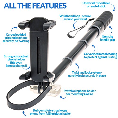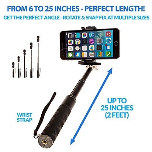 HIGHEST QUALITY: SmartSelfieStick® is better than most on the market. TEST IT! (More description below!). It works perfectly with any iPhone, almost any Smartphone and and you can mount any GoPro model onto it. It comes with 30 day MONEY BACK GUARANTEE + 1 Year Warranty (No fake Lifetime Guarantees). The kit includes: Our HQ-Selfie Stick + Wrist band, 1 Tripod, 1 Remote shutter + Phone Strap, 1 Charging Cable [for remote shutter], 1 Soft Pouch for the whole kit, 1 Manual. Discounted for a limited time. CRAZY CHRISTMAS SALE !!!