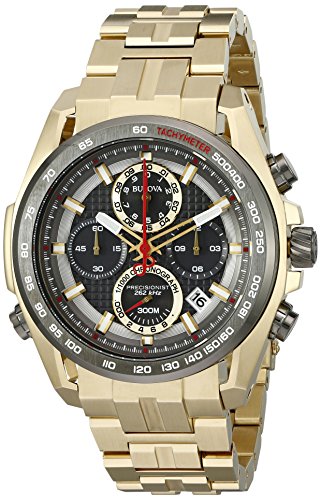 -. Binding : Watch -. Brand : Bulova -. Color : Gold -. Department : mens -. EAN : 0042429538092 -. Feature : Powered by Bulova's proprietary, high-performance UHF quartz movement, with a vibrational frequency of 262kHz-eight times greater than a standard quartz movement for unparalleled accuracy / Eight hand calendar chronograph in stainless steel with gold-tone and grey finish and grey dial / Quartz Movement / Case Diameter: 47mm / Water Resistant To 100m (330ft): In General, Suitable for Swimming and Snorkeling, but not Diving -. Label : Bulova Corporation -. Manufacturer : Bulova Corporation -. Model : 98B271 -. MPN : 98B271 -. PackageQuantity : 1 -. PartNumber : 98B271 -. ProductGroup : Watch -. ProductTypeName : WATCH -. Publisher : Bulova Corporation -. Studio : Bulova Corporation -. Title : Bulova Men's Quartz Stainless Steel Dress Watch (Model: 98B271) -. UPC : 042429538092