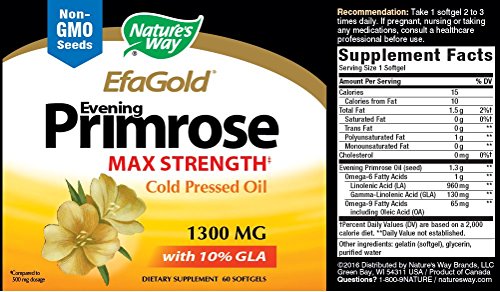 Studio : NATURE'S WAY Publisher : NATURE'S WAY Binding : Health and Beauty Product Description Nature`s Way EFAGold is the highest quality Evening Primrose Oil - guaranteed to contain 10% gamma-linolenic acid (GLA) from non-GMO seeds. GLA is an important Omega-6 essential fatty acid which must be obtained in your everyday diet. Cold pressed, unrefined, hexane free and zero trans fat. Hand harvested hand cleaned seeds, gently pressed for oil and tested for purity and potency. 0