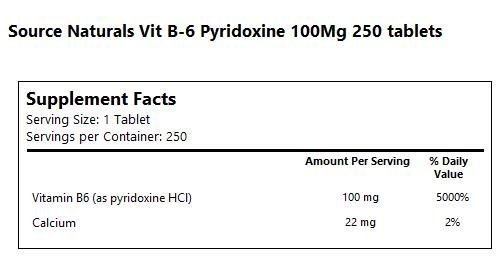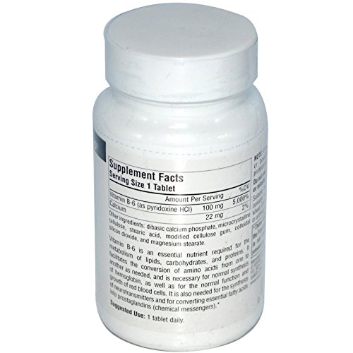 Studio : Source Naturals, Inc. Publisher : Source Naturals, Inc. Binding : Health and Beauty Product Description Vitamin Supplement. Vitamin B-6 is an essential nutrient required for the metabolism of lipids, carbohydrates, and proteins. It facilitates the conversion of amino acids from one to another as needed, and is necessary for normal synthesis of hemoglobin, as well as for the normal function and growth of red blood cells. It is also needed for the synthesis of neurotransmitters and for converting essential fatty acid into prostaglandins (chemical messengers). Suitable for Vegetarians and Hypoallergenic: Contains no yeast, dairy, egg, gluten, corn, soy or wheat. Contains no sugar, starch, salt, preservatives, or artificial color, flavor or fragrance. (These statements have not been evaluated by the Food and Drug Administration. This product is not intended to diagnose, treat, cure or prevent any disease.) 0