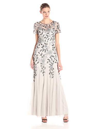 Short-sleeve gown featuring beaded flowers at bodice and un-beaded skirt with self-godets between pleats