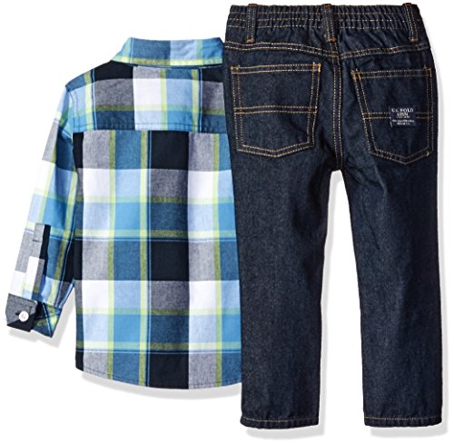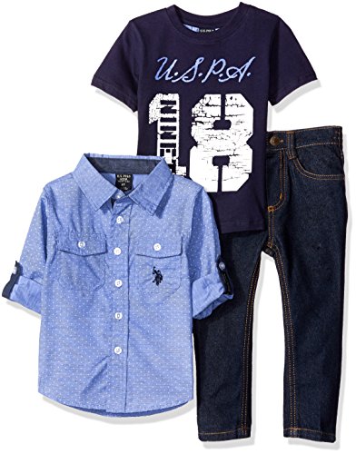 Button up sport shirt, logo t-shirt or creeper, and 5 pocket denim jean
