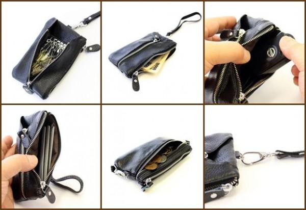 | キーケース部分の開閉はファスナーで、上部が開いているので使用頻度の高い鍵を出しておくことができるとても便利な構造です。キーは6連だからいろいろな鍵をひとまとめにできます。またその他に2つの便利なファスナーポケットを装備!小銭やお札、カードなども収納できるからこれさえあれば1つでALL収納OK!大き目のスマートキーもこのポケットへイン。取外しが可能なストラップも付いてとても便利です。 |