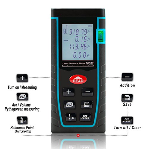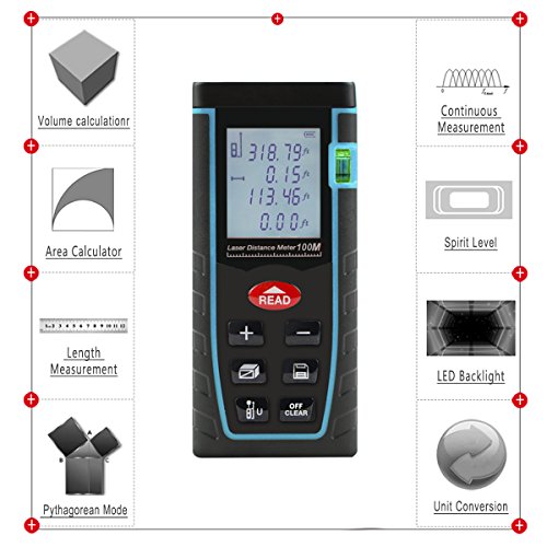 - Max measuring distance extends to 328ft / 100m, Distancemeasurement precision +/-2mm.