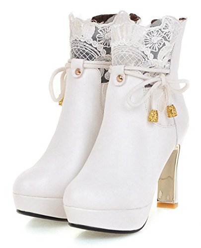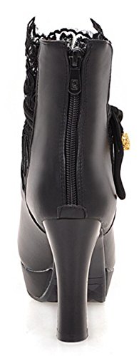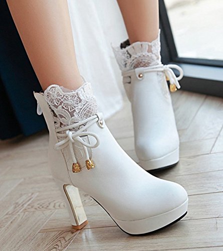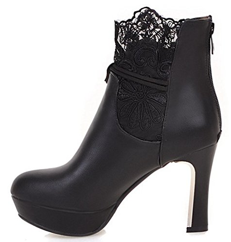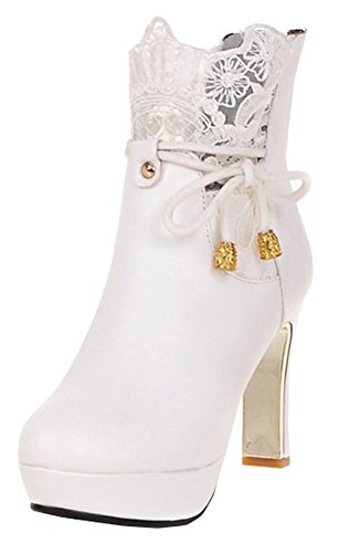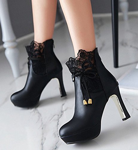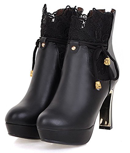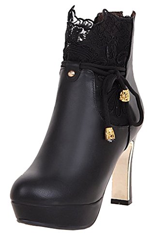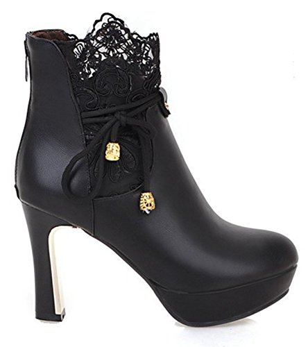 Binding : Apparel Product Description This pair of shoes is for women, girls, juniors and young ladies. You will look fashion and stylish when wearing them. The heels measure 3.7 inches. You will look slimmer and slender in their high block heels. This pair of shoes features solid upper and ankle high. The lace decoration on the one vamp will make you chic among the crowd. You will look sweet in their round toe. It's convenient for you to wear in their back zipper closure. The sole is made of good rubber. You will feel comfortable in their soft bottom. They are of high quality and durable. Come on and take them away! 0