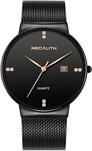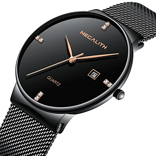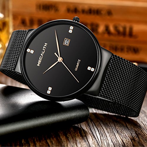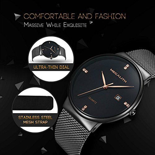 Unique and Elegant DESIGN: Simple and luxury Black Dial with Calendar, Thick and Comfortable Black Mesh Stainless Steel Bracelet; High hardness mineral glass watch face; IP Black plating watch case will never fade; Case diameter: 40mm; Band Width: 20mm; Case Thickness: 10mm; Band Length: Men's Standard. Luxury design and comfortable wearing experience, this is a perfect travel and business casual watch for you