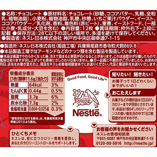 原材料:準チョコレート(砂糖、乳糖、植物油脂、全粉乳、ココアバター)、小麦粉、植物油脂、乳糖、砂糖、いちご果汁パウダー、全粉乳、イースト、ココアパウダー、カカオマス、ココアバター、乳化剤、着色料(赤ビート、紅麹)、香料、重曹、イーストフード、(原材料の一部に大豆を含む)