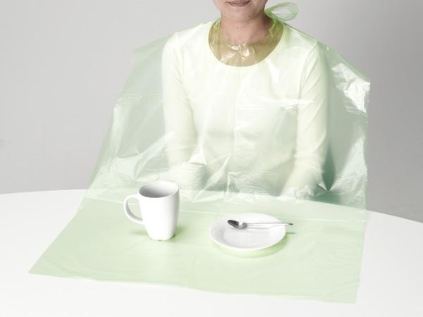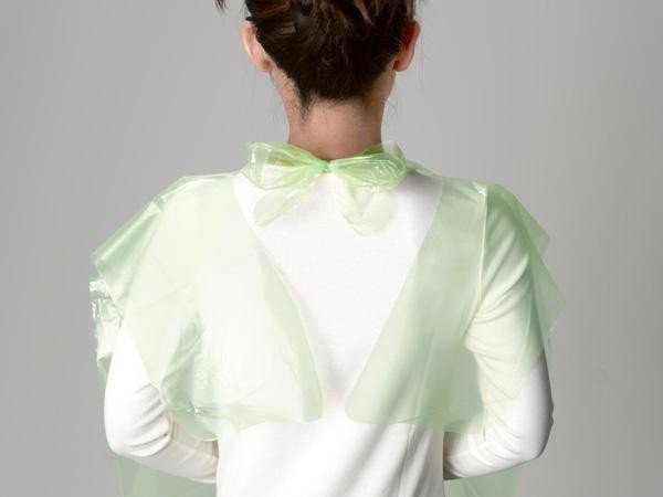 ディスポーザブルタイプの経済的な食事用エプロンです。首の後ろで軽く結ぶことで首回りにぴったりフィットし、衣類への汚れの付着を防ぎます。