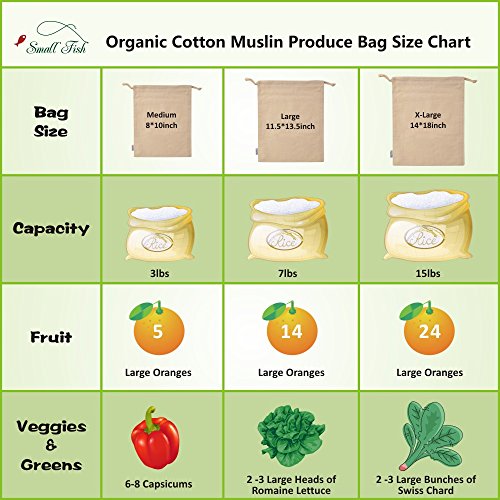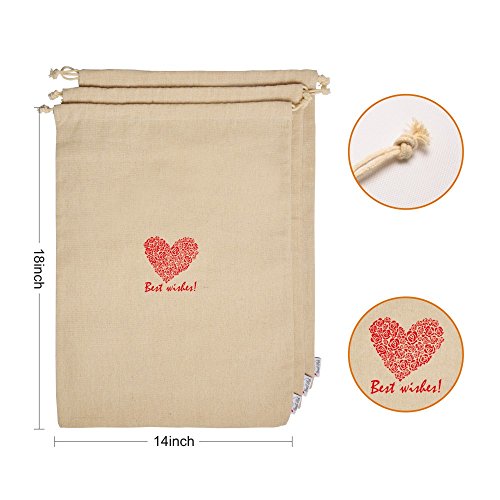 Organic Cotton Muslin Bag, Reusable Produce Storage with Drawstrings; X-Large 14x18 Inch 3 Pack, Multipurpose Gift-Bags Great for Grocery Shopping and Household Organizing, Washable Canvas w/ String