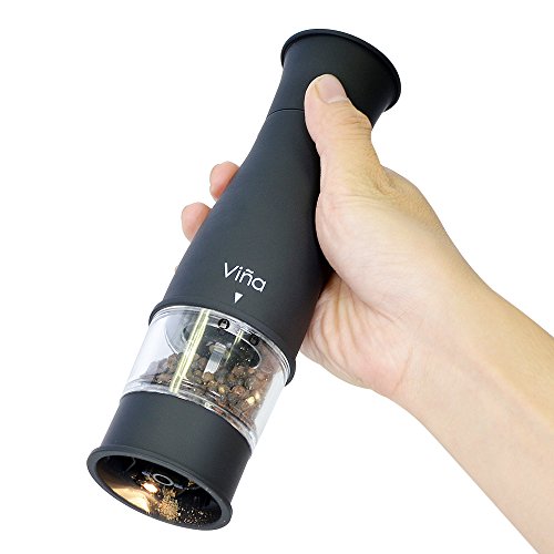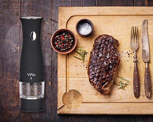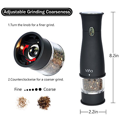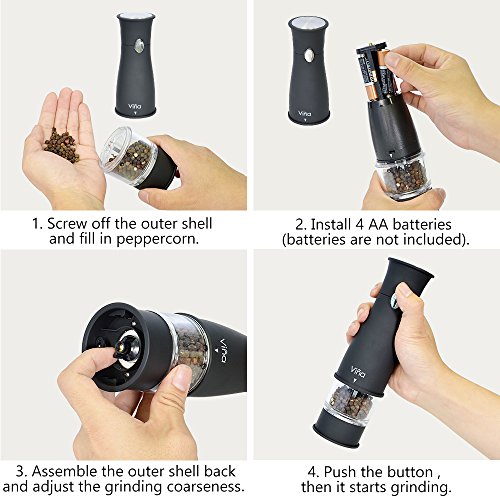 Easy to use: Unscrew the cap on the top to open the mill. Fill the spice in to the grinder. Once filled, crank the grinder and body make it simple to see the level of the spice left inside the grinder and grind by pushing the top button. Easy to adjust controller for either fine or coarse grinding. An LED light at the bottom of the grinder helps with accurate portion control in a dim environment. Requires 4 AA Batteries. (Batteries is not included)