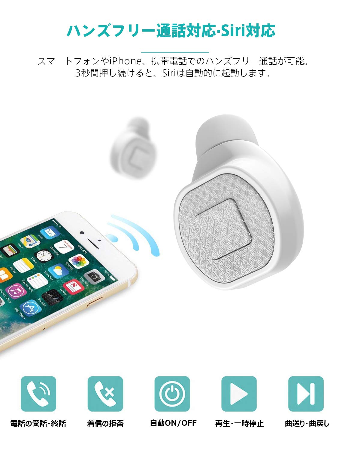 ❾ヘッドホン本体でのかんたん操作。本体のボタンにより、「再生/一時停止」「曲送り/曲戻し」「電話の受話/終話」のほか、「着信の拒否」、「Siri起動」、「自動ON/OFF」などの操作が可能です。❿付属品 : Bluetoothイヤホン、充電式収納ケース、充電用ケーブル、イヤチップ、取扱説明書