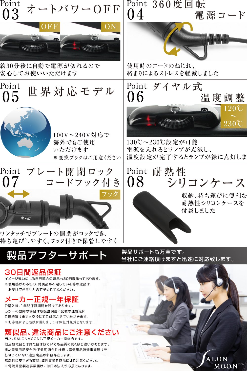 - ✅ 【 安心検査 】PSE適合性検査 電気用品輸入事業者届け出済み ( 検査を行なっていない違法製品が多々見受けられます。また届出には日本法人である必要がり、販売者が海外事業者等では保障を受ける事は出来ません ) 【 🚫 電子音について 🚫 不良品ではございません 🚫 】電源を入れるとイオン発生器により多少電子音が発生致します。商品の品質には問題はございませんのでご安心してご使用ください。 【 🚫 模倣品にご注意ください 🚫 】 弊社の商品の模倣品が出回っているとお問い合わせを頂いております。弊社の商品と品質、仕様が明らかに違います。模倣品の製品の不良に関しまして、弊社では一切対応できません。 【 🚫 電源コードは正しくお使いください 🚫 長くお使いいただけない理由 🚫 】 他社製も含め ( 高価なアイロンも全て同じです )、 ヘアアイロンの電源コードは細い導線の集合体で出来ており、電源コードが絡まった状態でのご使用、本体に巻きつけて保管されますとダメージが蓄積し、断線に繋がってしまいます。長くお使いいただく為に電源コードは正しくお使いください。