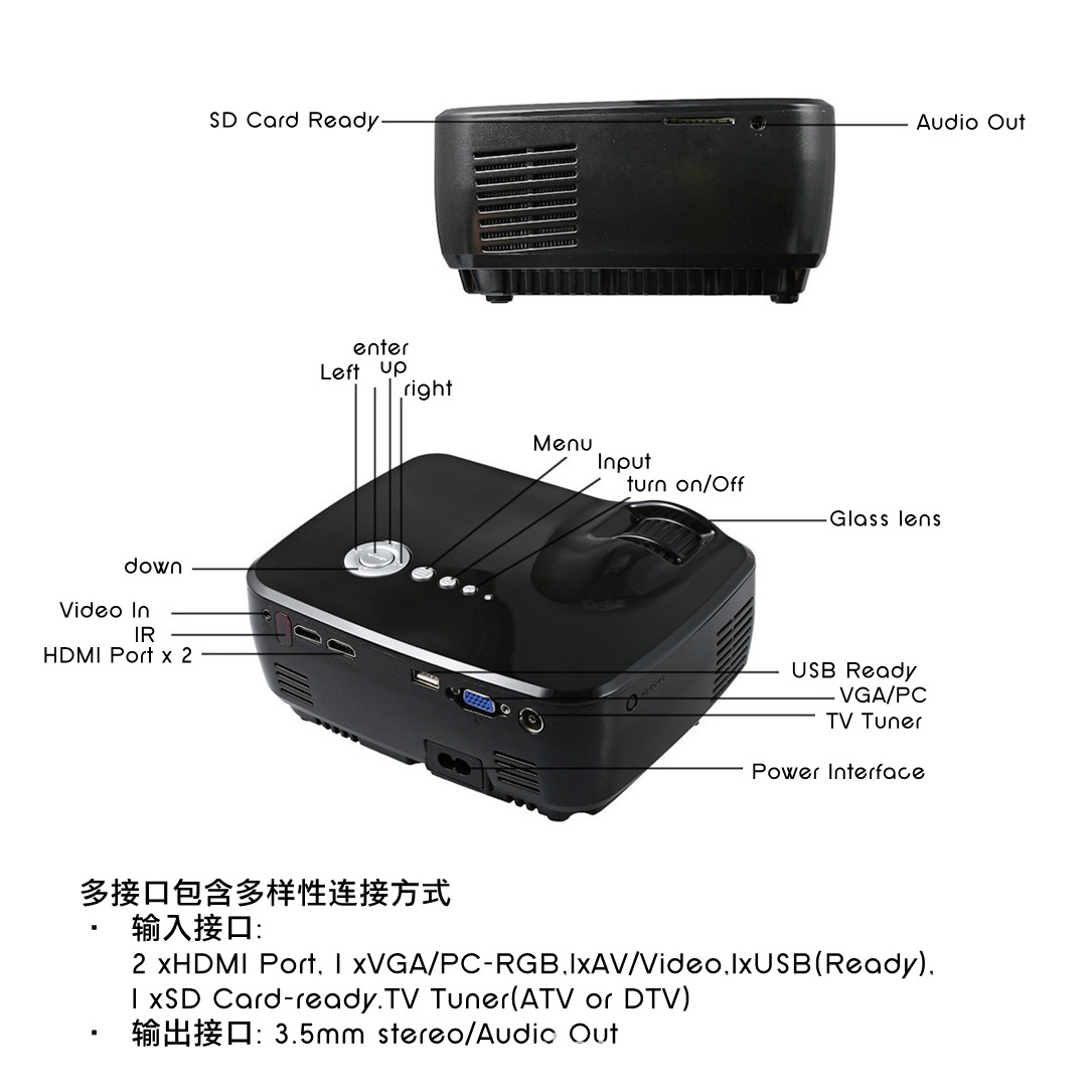 功能:可插U盘,移动硬盘,AV三合一线连机顶盒,DVD,另配VGA线或HDMI线连电脑等。