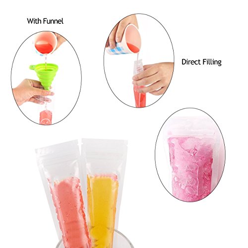 - Easy for homemade snack popsicles no matter where you go, Just fill the bags through the funnel, then zip seal and freeze them, our ice pop pouch can hold either thick or liquid fluids, just lay them flat in the freezer and wait for a few hours before you go get them.