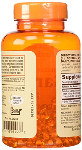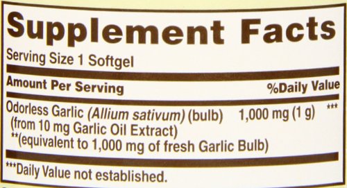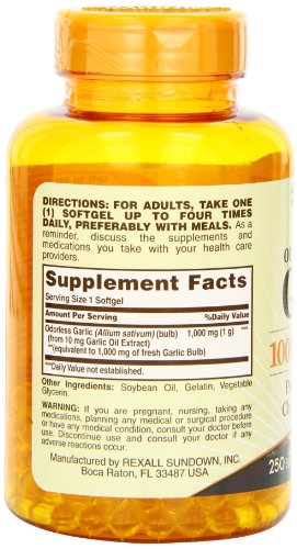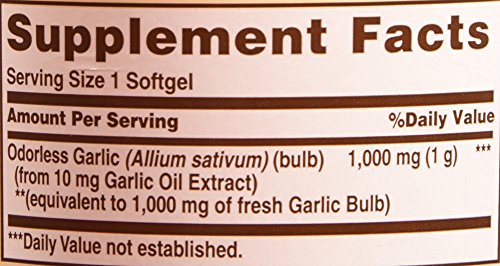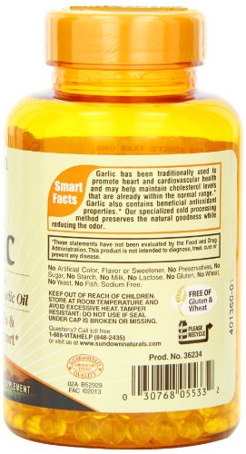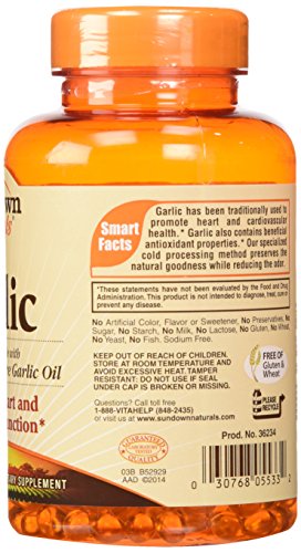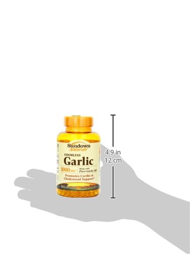 -. Binding : Grocery -. Brand : Sundown Naturals -. Feature : Garlic is known for its antioxidant properties, and helps maintain cholesterol levels already within a normal range / These odorless softgels bypass the stomach, to prevent the unpleasant aftertaste of garlic / These statements have not been evaluated by the Food and Drug Administration This product is not intended to diagnose, treat, cure or prevent any disease -. Label : Sundown Naturals -. Manufacturer : Sundown Naturals -. ProductGroup : Grocery -. ProductTypeName : GROCERY -. Publisher : Sundown Naturals -. Studio : Sundown Naturals -. Title : Sundown Naturals Odorless Garlic 1000 mg Softgels