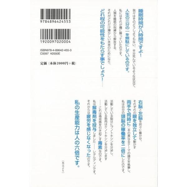 【商品説明】 定価(税込み):2,160円 値引き:10% OFF 睡眠時間が八時間ですよ!我々はそのどうしようもない、半分死んでいるような状況で、人生の三分の一を無駄にしているのです。私にはそれが癪に障っていたのです。人類を睡眠の呪縛から解放する、それがどれだけ輝かしい未来のためになり、どれ程の可能性をもたらす事でしょう!……(本文より) バーゲンブック 新品 特価 格安 文芸 海外文学 評論 作家論 海 | |