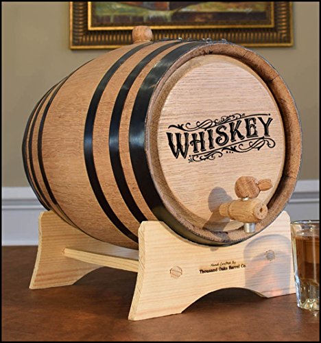 Laser inscribed handcrafted American White Oak ReCoop ® Barrel with 'Whiskey' design. This barrel is manufactured from premium bourbon barrels made in the USA, has a medium char and comes with the stand, bung, wooden spigot and storing tablet. ? Perfect for aging Wine, Beer, Tequila, Brandy, Whiskey, Scotch, Bourbon, Rum, Cognac or any spirit that benefits from aging. Because of natural variations of wood, the overall appearance of the inscription will vary slightly. ? Available in 2, 3, 5, 10 and 20 liter sizes. ? Dimensions: 1 Liter 6.5' x 4.5' x 4.5' inches 2 Liter 7.5' x 5' x 5' inches 3 Liter 8.5' x 5.5' x 5.5' inches 5 Liter 9.5' x 6.5' x 6.5' inches 10 Liter 12' x 8' x 8' inches 20 Liter 15' x 10.5' x 10.5' inches Char: Medium Hoops: 4-6 hoops Accessories: - Laser Inscribed design
