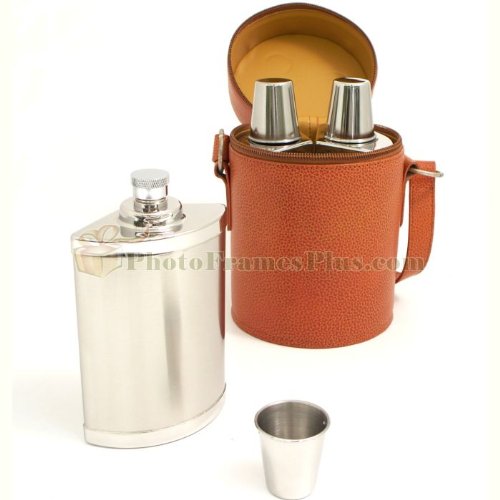 -. Feature : Genuine leather case / Stainless steel flasks & shooter cups / Rubber seals under caps / Zipper closure / Dimensions: 4.5 dia. X 7