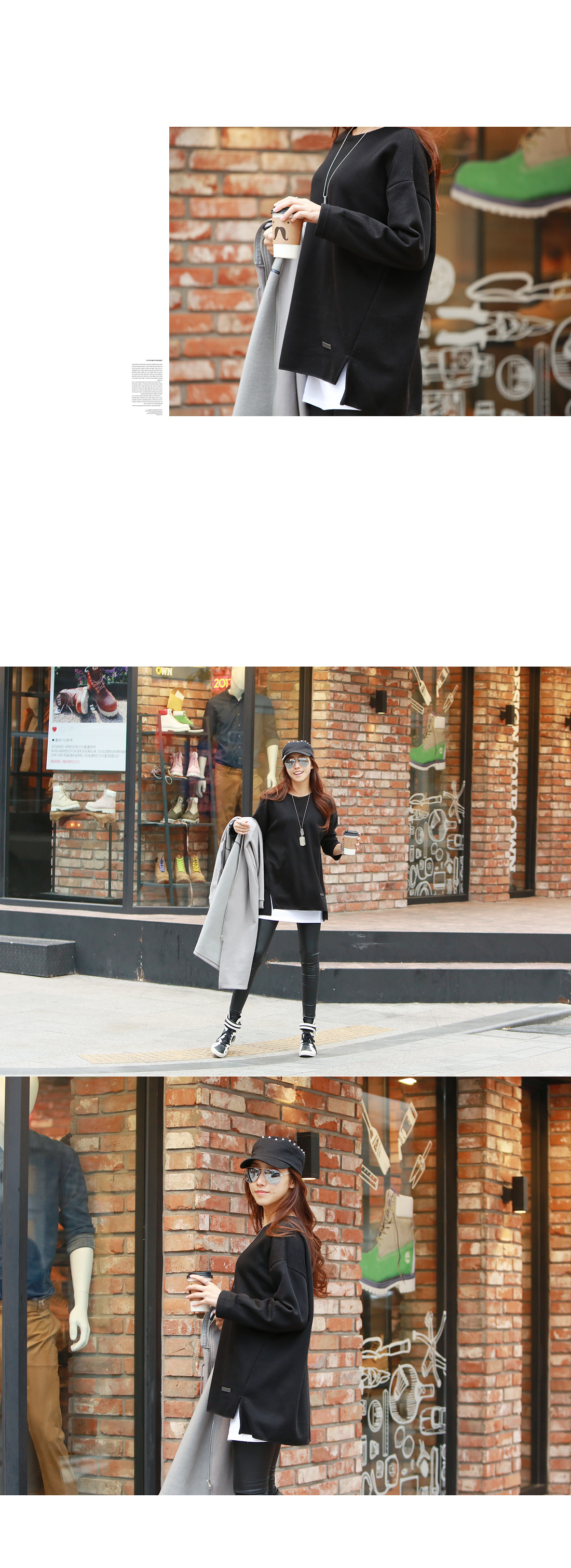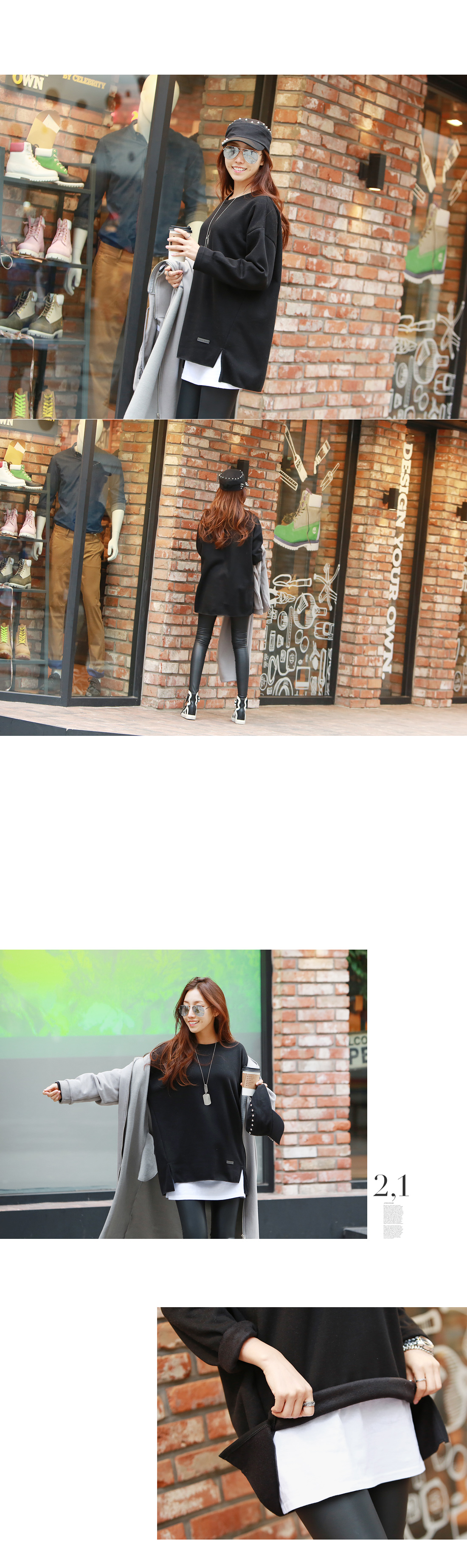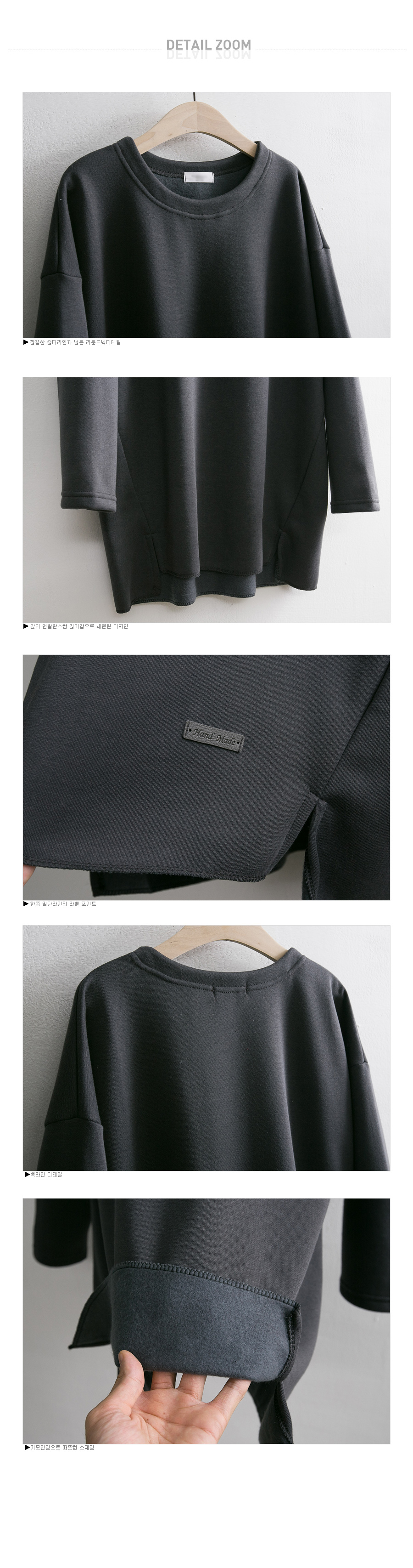 보엘리 라벨포인트 롱 티셔츠 #102944 MD COMMENT 편안한 착용감의 박스티셔츠 소개해 드려요~ 전체적으로 루즈한 핏에 여유있는 라운드 네크라인으로 목선이 자연스럽게 드러나 여성스러운 느낌이랍니다 부드럽고 따뜻한 소재감으로 착용했을때 너무 편하구요 깔끔하고 베이직한 디자인에 내추럴한 멋스러움으로 데일리로 즐기기 좋은 아이템 입니다 DETAIL TIP 프론트 하단 한쪽으로 레더라벨을 매치해서 밋밋함을 없애주었구요 측면라인을 살짝 앞으로 마감하고 끝으로 슬릿을 주어 세련된느낌으로 엣지있게 포인트를 주었습니다 안쪽으로 보들한 기모처히되어있어 겨울동안 편안하고 따뜻하게 착용하실 수 있답니다 COLOR,SIZE TIP 컬러는 아이보리,블랙,차콜,네이비컬러로 구성되어 있으며, 모델의 착용 컬러는 블랙 입니다. 사이즈는FREE(44-66)사이즈로 진행되오니 고객님의 체형에 맞게 선택하셔서 예쁘게 착용하시길 바랍니다.