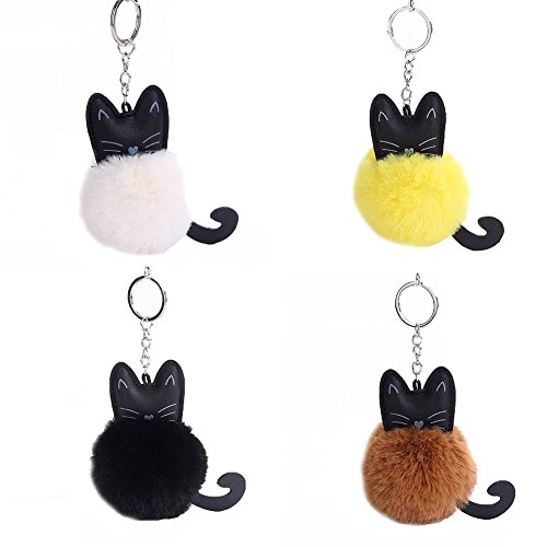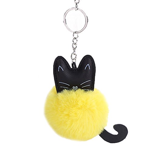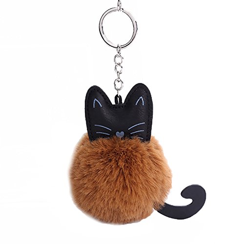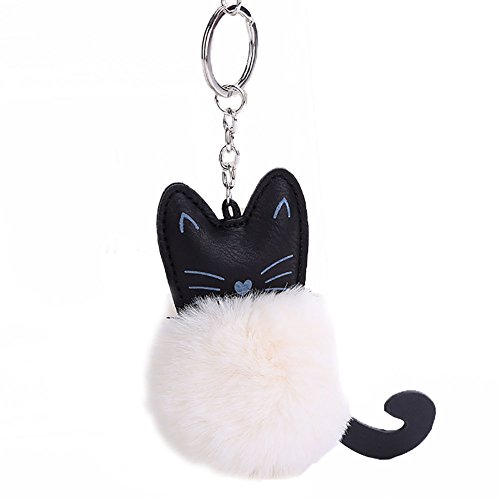 Mwfus Cute Black Cat key Chain Charms with Rabbit Fur Pompom Ball Keyring Handbag Purse Keyfobs