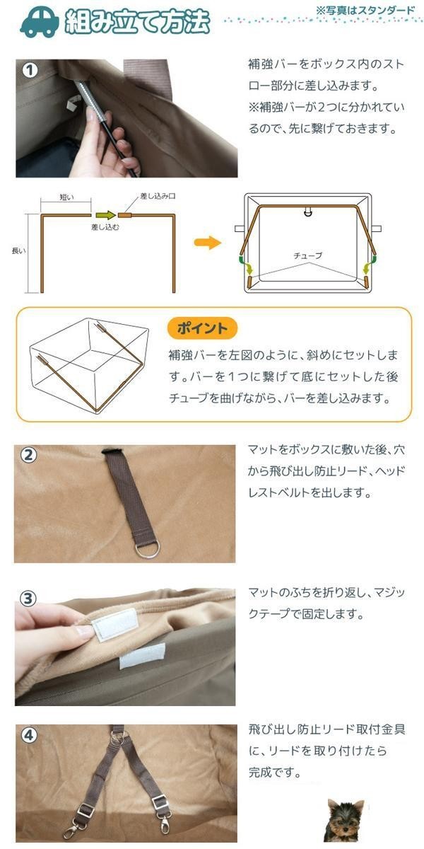 | ブースターボックスはボックス内にペットを繋ぎ、窓に足を掛けて立ったり座ったりする動作ができないつくりになっているため、足腰への負担の心配もなく、飛出し防止リードがついている為、車内で動き回ることもありません。ヘッドレストのある車種に取り付ける事が可能で、ヘッドレスト固定ストラップは長さ調節が可能なのでワンちゃんが外を見通せる高さに合わせたり、お好みの高さでご使用いただけます。 |