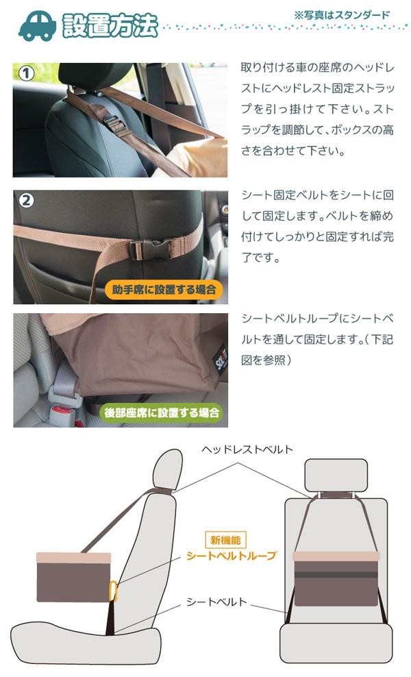 ブースターボックスはボックス内にペットを繋ぎ、窓に足を掛けて立ったり座ったりする動作ができないつくりになっているため、足腰への負担の心配もなく、飛出し防止リードがついている為、車内で動き回ることもありません。ヘッドレストのある車種に取り付ける事が可能で、ヘッドレスト固定ストラップは長さ調節が可能なのでワンちゃんが外を見通せる高さに合わせたり、お好みの高さでご使用いただけます。 |