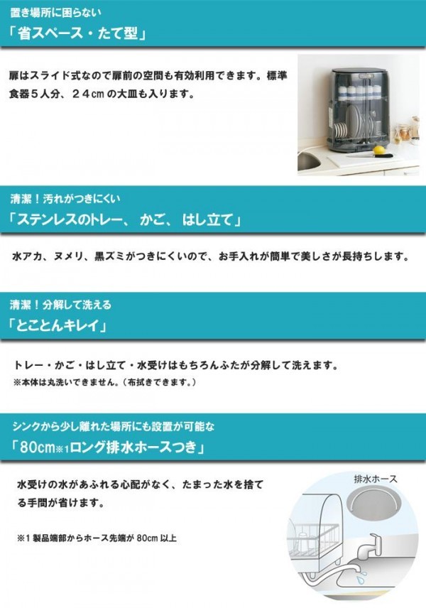 fk094igrjs5人分の食器を乾かす事ができます。Ag+抗菌加工の排水ホース、水受けを採用しています。 製造国:中国 素材・材質:PS、PP、ステンレス 付属品:Ag+抗菌加工排水ホース(80cm)、取扱説明書(保証書付き、保証期間:1年間)※お届け地域により、別途運賃がかかる場合やお届けできない場合がございますので、お問い合わせ下さい。