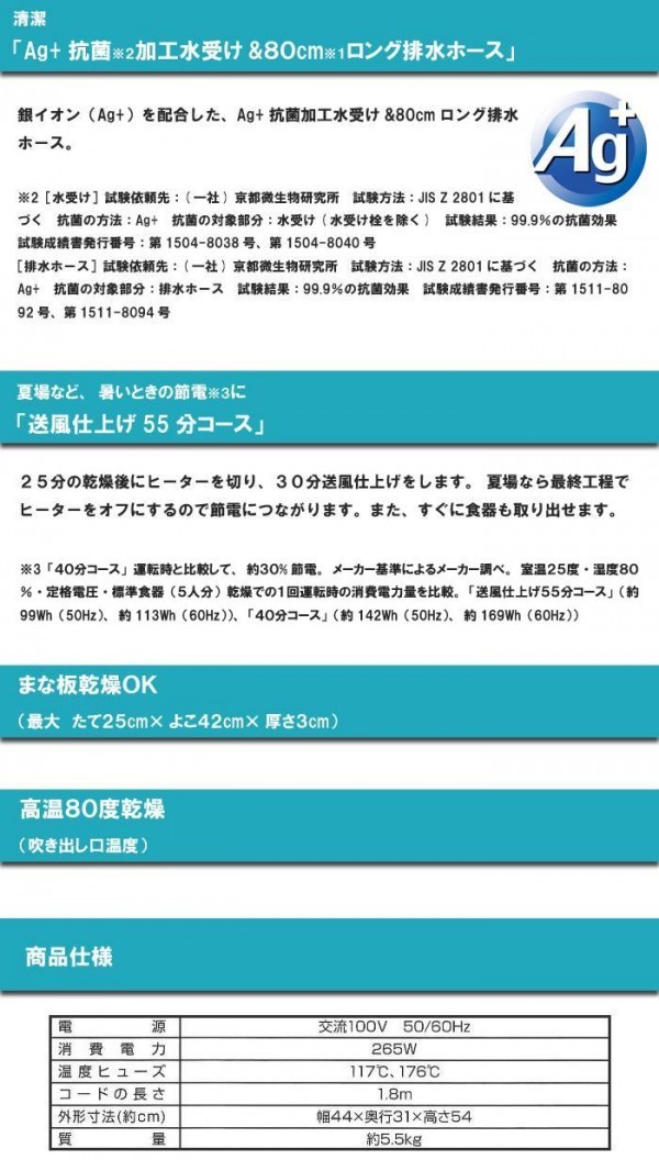 5人分の食器を乾かす事ができます。Ag+抗菌加工の排水ホース、水受けを採用しています。