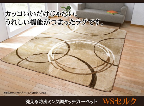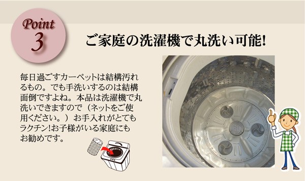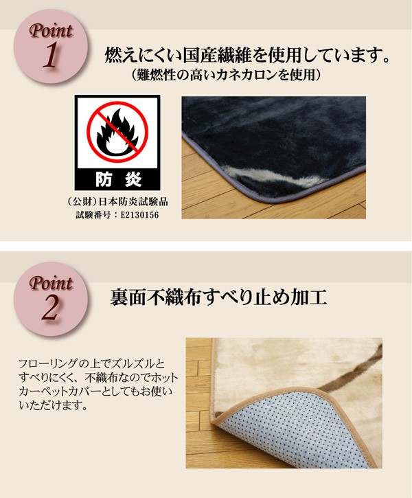 パイルに難燃繊維「カネカロン」を使用した防炎ラグカーペットです。ふわっとした肌触りでタッチ感にもこだわった商品です。洗濯機丸洗い可能なウォッシャブルタイプなので、いつでも清潔にご使用頂けます。秋冬はホットカーペットカバーとしてもご使用頂けます。