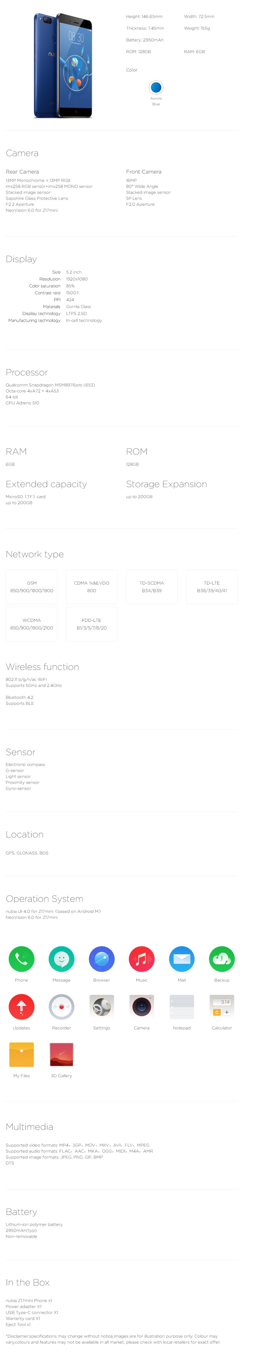 The ZTE Nubia Z17 mini is a dual SIM (GSM and GSM) smartphone that accepts Nano-SIM and Nano-SIM. Connectivity options include Wi-Fi, GPS, Bluetooth, NFC, USB OTG, Headphones, FM, 3G and 4G (with support for Band 40 used by some LTE networks in India). Sensors on the phone include Compass Magnetometer, Proximity sensor, Accelerometer, Ambient light sensor and Gyroscope.