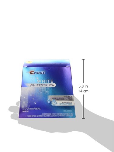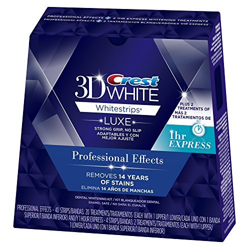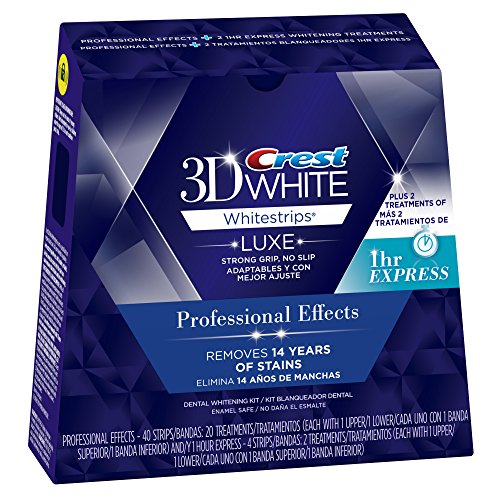 Important usage information: Keep out of reach of young children. Product is not intended for use in children under the age of 18. Do not swallow plastic strip. Do not eat, sleep, smoke or drink (with the exception of water) white wearing Crest 3D White Professional Effects or 1 Hour Express Whitestrips. Your dentist and Crest want to keep your teeth healthy. Visit your dentist regularly. Crest 3D White Whitestrips is not a substitute for regular dental care. Avoid eye contact. Rinse eyes thoroughly with water if gel comes in contact with them. Handle strips with dry hands. Gel that comes into contact with the skin can cause temporary skin irritation and/or whitening. Wash hands with soap and water after applying the strips. Tooth Sensitivity & Gum Comfort: Crest 3D White Whitestrips Luxe Professional Effects and 1 Hour Express are specifically designed to provide a high level of whitening. With products that offer a high level of whitening, there is a greater chance that you may experience tooth sensitivity and/or gum discomfort. This is temporary and not harmful. See insert for more information. If you are in need of dental work, have dental work, or have staining from medication, ask your dentist if whitening is appropriate. Crest 3D White Whitestrips with Advanced Seal technology are designed to hold well to teeth. Do not use on loose teeth, restorations, or braces. Crest 3D White Whitestrips will only whiten natural teeth. The strips will not whiten caps, crowns, veneers, fillings or dentures. Avoid contact of gel with cloth, leather or fabric. Store in cool place. Best if used by date noted on package. Questions: 1-800-395-8423 or visit www.3Dwhite.com Package includes: Professional Effects - 40 strips: 20 treatments (each with 1 upper/1 lower) and 1 Hour Express - 4 strips: 2 treatments (each with 1 upper/1 lower)