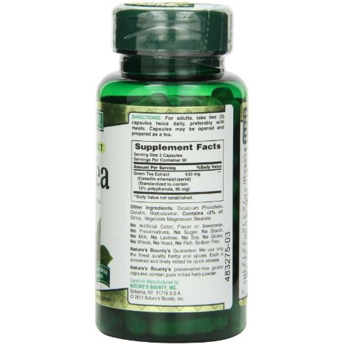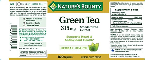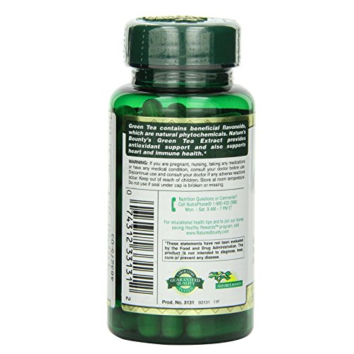 ReleaseDate : 2012-10-15 Studio : Nature's Bounty Publisher : Nature's Bounty Binding : Health and Beauty Product Description Nature's Bounty Green Tea is a nutritional staple in Japan where it has been used for centuries. Green Tea contains beneficial flavonoids, which are natural phytochemicals that provide antioxidant support and health-enhancing properties.* Our "non-irradiated" Green Tea Extract contains naturally occurring EGCG. 0