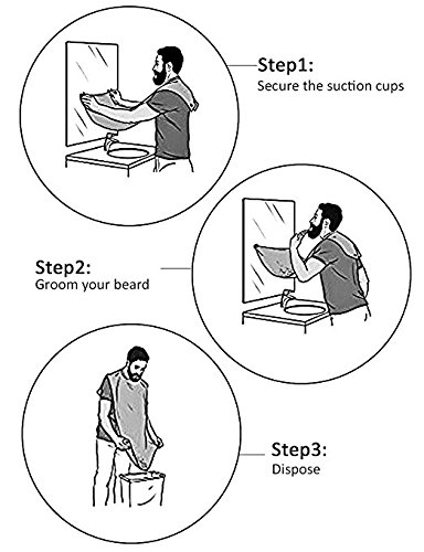 - • EASY TO USE - Experience the feeling not having to clean and wash the entire bathroom after shaving your beard. Unlike MANY other aprons, this is made of high quality fabric and not cheap materials. Simply attach the neck straps and secure to mirror. Begin with your normal grooming regimen. If you need to stop and step away during grooming you can attach the neck straps to the hooks on the suction cups. Once complete lower over the trash can and gently shake. One Size Fits All.