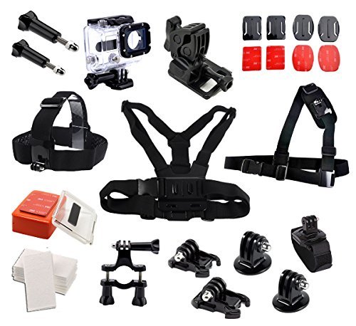 Inclusions: 1.) Head Strap 2.) Chest Body Strap 3.) Bike mount+3adjust arm 4.) 2x Flat & 2x Curved Mounts with 3M adhesive pads 5.) 2x Black Buckle Basic Mount 6.) 2x Black Tripod Mount Adapter 7.) 2x Thumb Knobs 8.) Anti-fog Inserts 9.) Backdoor and Floaty Sponge 10.) Waterproof Case 11.) Shoulder Strap 12.) Wrist Strap 13.) Sports Mount