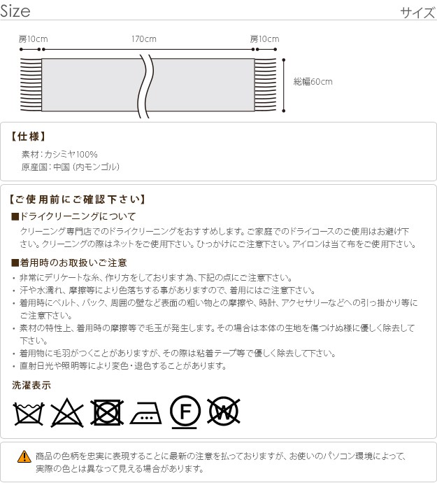 ※メーカー直送のため代金引換はお受けできません。※沖縄・一部離島は別途送料がかかります。お見積もりいたしますのでお問い合わせ下さい。【カラーバリエーション】ベージュxブラウン・レッドxベージュ・グリーンxグレー・ネイビーxグレー【仕様】カシミヤ100%【サイズ】幅190x奥行60cm重量:約0.24kg房長さ:両サイド各10cm株式会社ナカムラ(61700045)