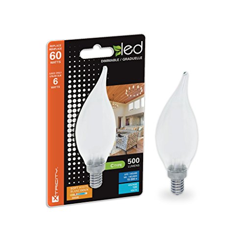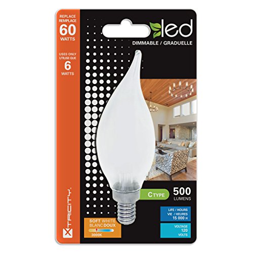 Xtricity LED Candelabra Filament Flame Tip Frosted Bulb, 6 Watts ( 60 Watt Equivalent ) 120 Volt, E12 candelabra Base 3000K Soft White Dimmable Candle Led Bulb, UL Listed (Pack of 6)