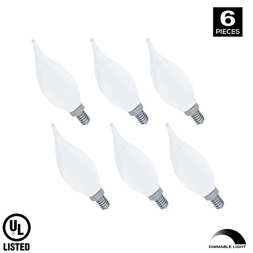 - ✔ KEY FEATURES - Clear glass, energy efficient, no flicker, dimmable, 3000K soft white light appearance, 500 lumens, smooth and round beam pattern in a wide angle of 360° , E12 candelabra base, uses 6 watts of energy and 120 volt.