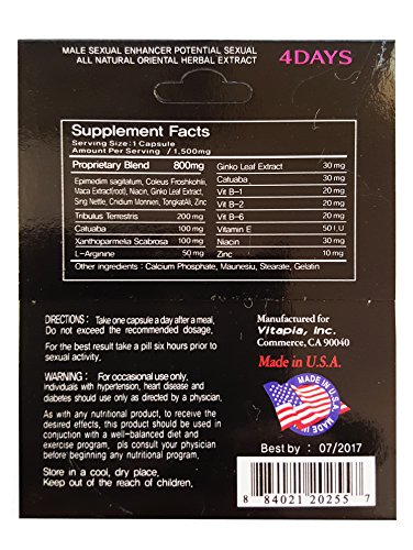 Take one capsule a day after a meal. Do not exceed the recommended dosage. Warning : For occasional use only. Individuals with hypertension, Heart disease. and diabets should use only as direted by a physician. As with any nutritional product, to receive the desired effects, this product should be used in conjuction with a well-balanced diet and exercise program. Please consult your physician before beginning any nutritional program. Prohibited to be used by anyone under 18.Feature