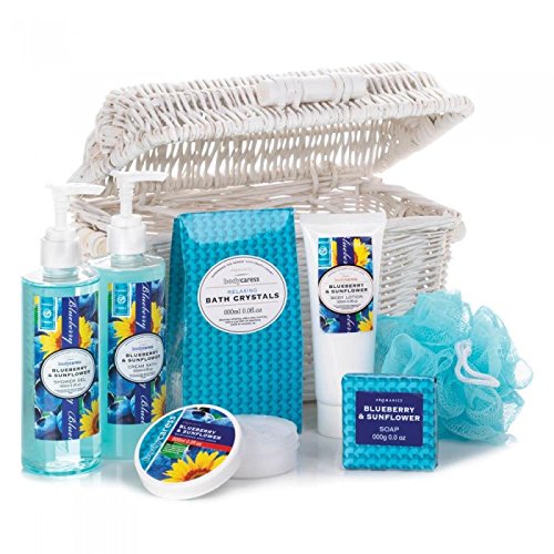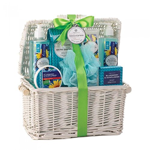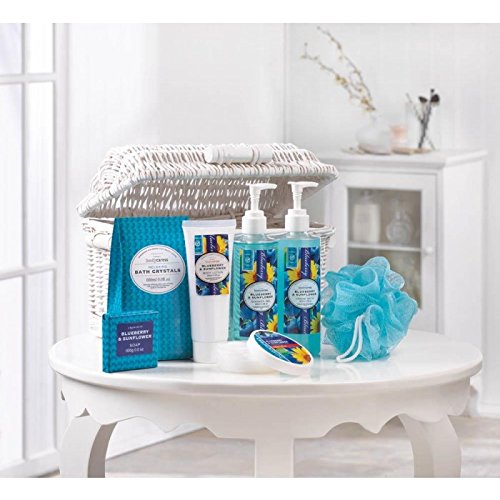 Bath BLUEBERRY & SUNFLOWER SPA BASKET Baskets New Gift Lotion Gel Chrystals Soap Loofah Bathroom Care Set