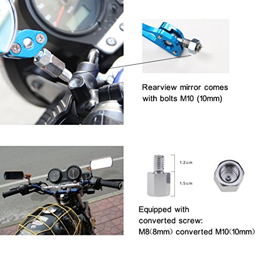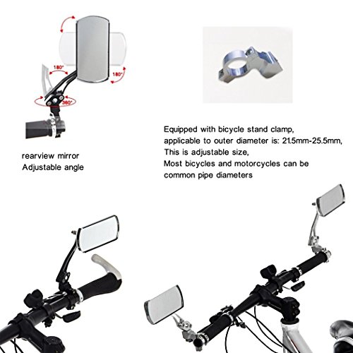 -. Feature : Made from Ferro-aluminium,durable and nice / Equipped with bicycle stand clamp, applicable to outer diameter is: 21.5mm-25.5mm / This is adjustable size, Most bicycles and motorcycles can be common pipe diameters / 5 available color:red,green,black,blue,gold / Rearview mirror comes with bolts M10 (10mm) ,Equipped with converted screw: 8mm 10mm converted