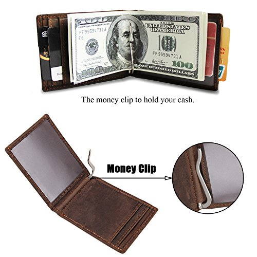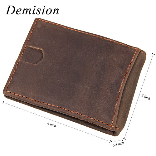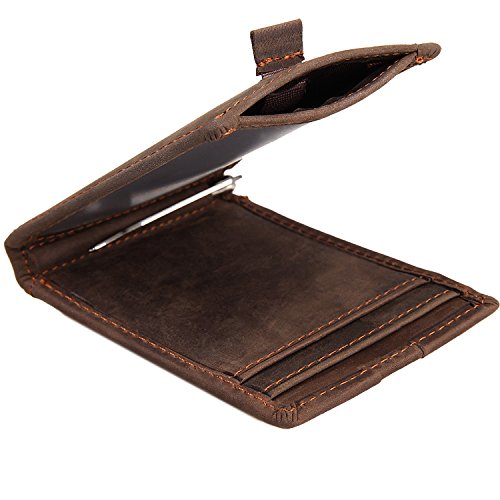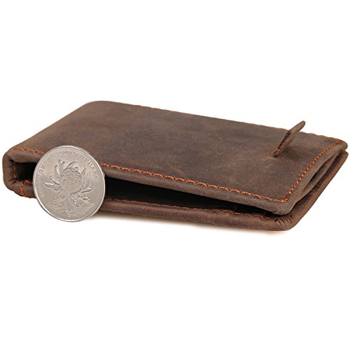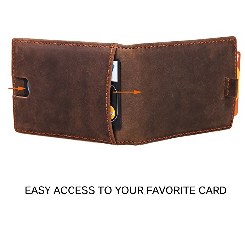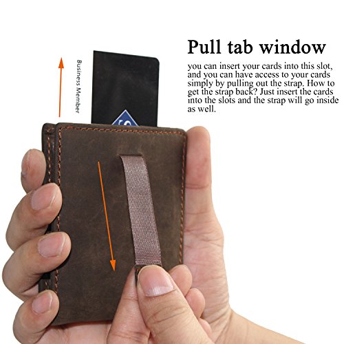 -. Feature : QUALITY LEATHER AND CRAFTSMANSHIP -- Crafted with an obsessive attention to detail, our wallets are hand crafted from beautiful Crazy-Horse Leather.The most significant feature about Crazy Horse Brand bull leather is disordered scratches on the surface, which is the style of retro and wildness. However the leather has high quality, it is unavoidable to have small scratch on it. The leather will looks better, if you use a dry cloth or hand to wipe it gently. / SLIM AND STYLISH -- Designed Quick Access ID Windows, Holds up to 10 cards plus US bills with bulk.The wallet is easy to put in a purse or a pocket and know that it is safe. / VARIOUS POCKETS -- 1 x cash pockets. Easily for keeping precious items like money,notes etc. 2 x ID windows.keep ID cards,photos,driver's license etc.4 x card slots.keep cards. / WALLET DEMISIONS -- 4 x 3 x 0.4 inch (12.5x10x1cm) Weigt:0.26 lb (0.12 kg).Looks classy and very slim.the pull tab window is the most interesting and useful design-you can insert your cards into this slot, and you can have access to your cards simply by pulling out the strap. How to get the strap back? Just insert the cards into the slots and the strap will go inside as well. / It can be used for personal use, birthday gifts, business gifts, opening ceremonies, advertising promotions, fairs, employee benefits etc.