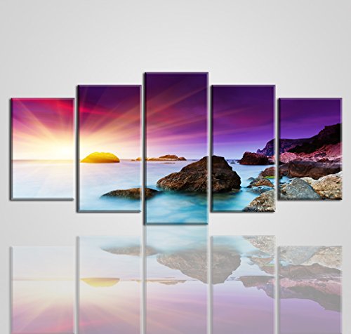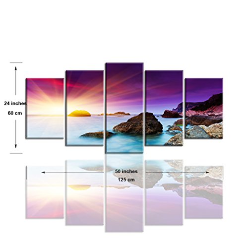 -. Title : Piy Painting CANVAS P.R.INTS for Living Room or Bedroom,Purple Sunset Beach Picture, Framed Oil Painting Giclee Reproduction Wall Art (Pink & Blue, 5 Panels, 50" by 24" overall size)
